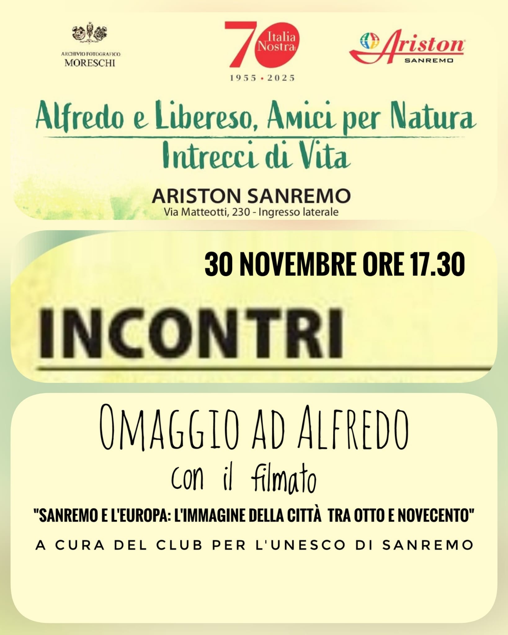 Nell'ambito degli Incontri per il mese dedicato a Libereso Guglielmi e Alfredo Moreschi, domenica 30 novembre all'Ariston di Sanremo, via Matteotti 230 ingresso laterale, si terrà la proiezione del filmato "Sanremo e l'Europa: l'immagine della città tra Otto e Novecento".
