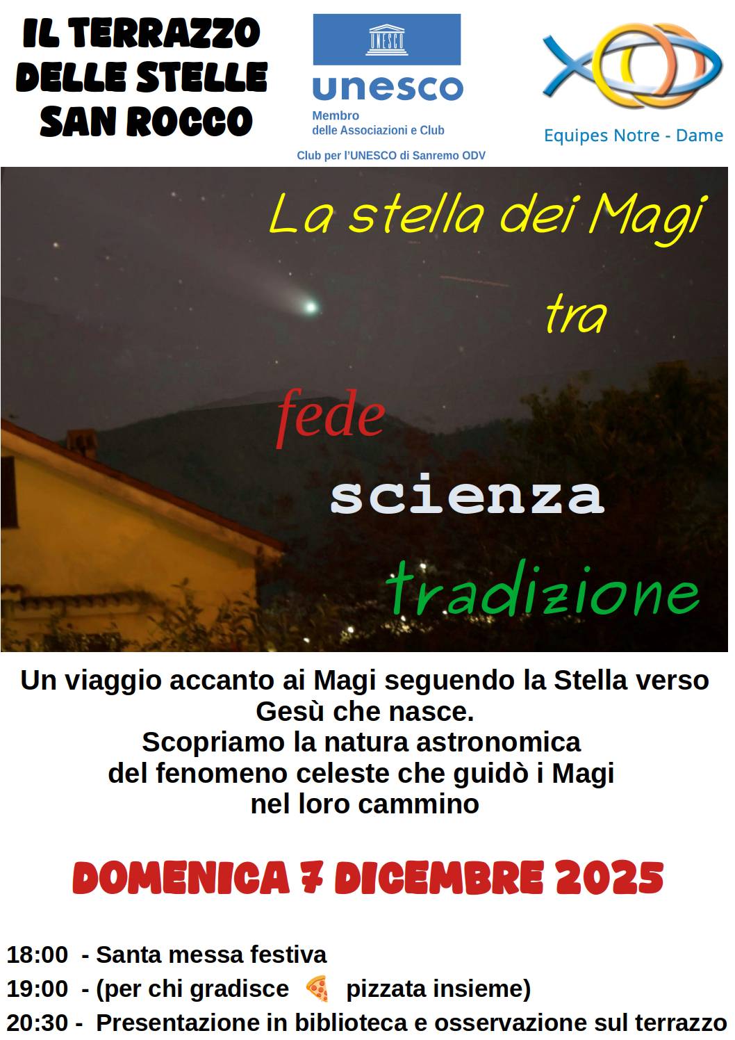 Domenica 7 dicembre, sul terrazzo della chiesa di San Rocco a Sanremo, il Terrazzo delle Stelle di San Rocco, con l'Equipes Notre - Dame e il Clun per l'UNESCO di Sanremo, organizza un "viaggio accanto ai Magi seguendo la stella verso Gesù che nasce. Scopriamo le natura astronomica del fenomeno celeste che guidò i Magi nel loro cammino".